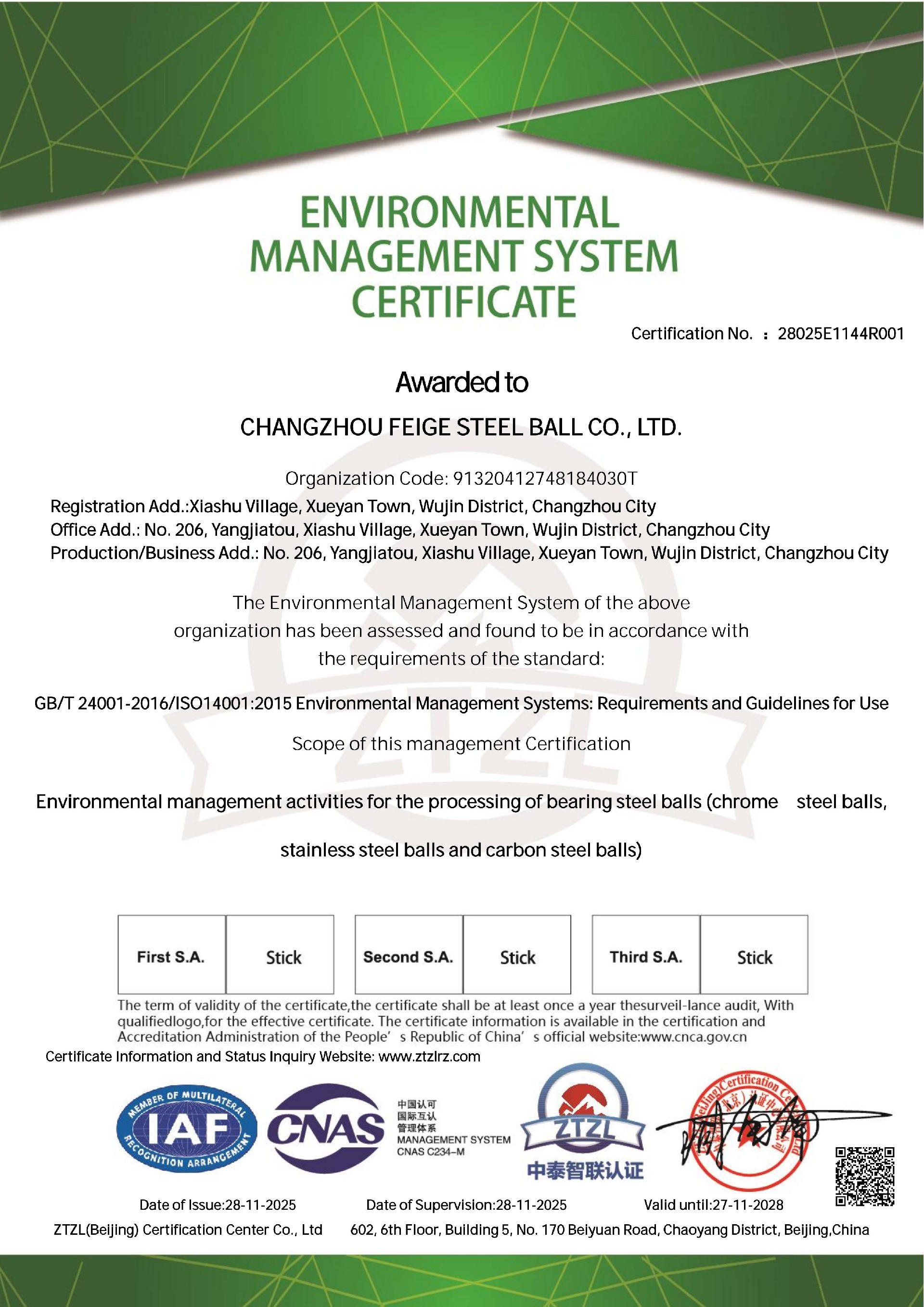 环境管理体系认证证书